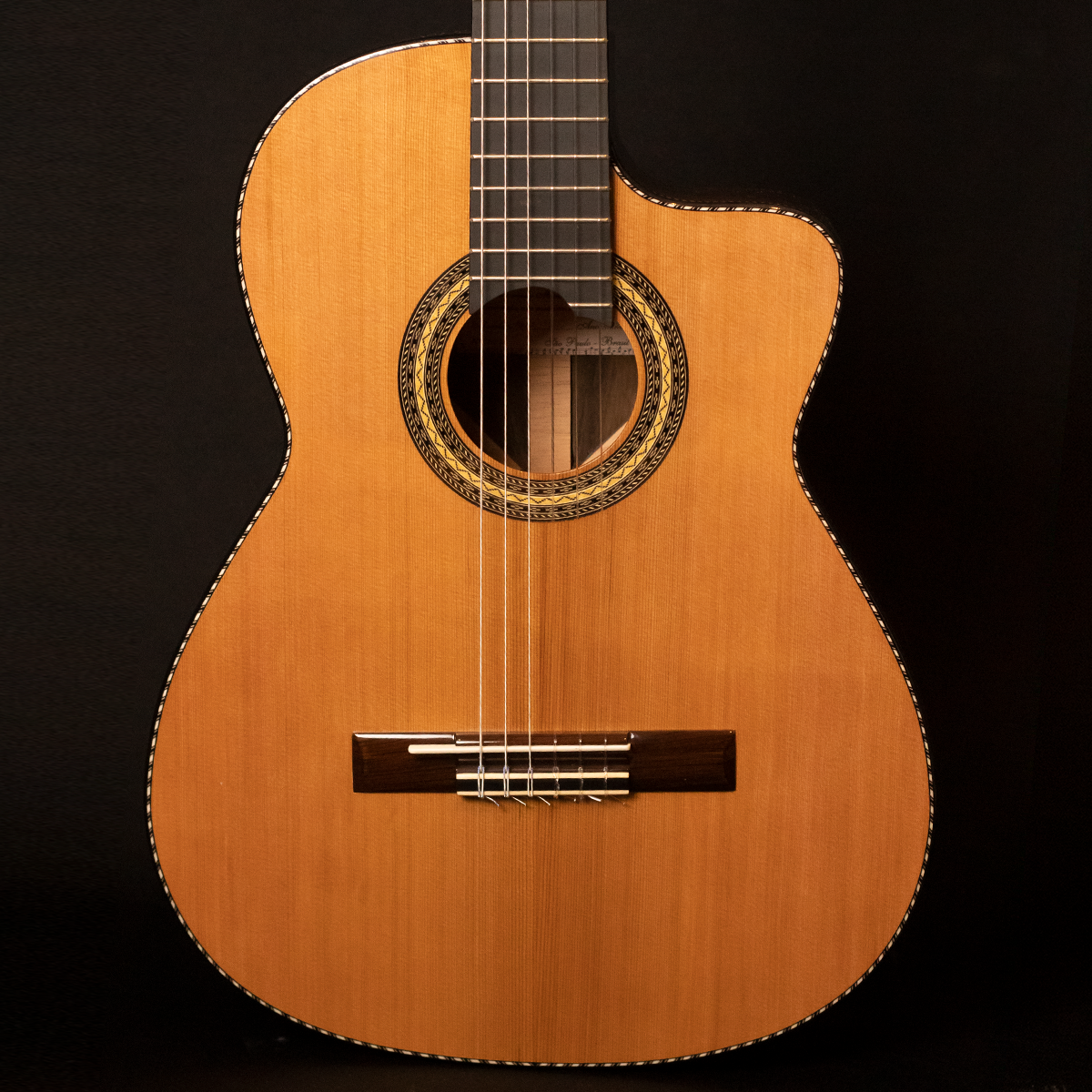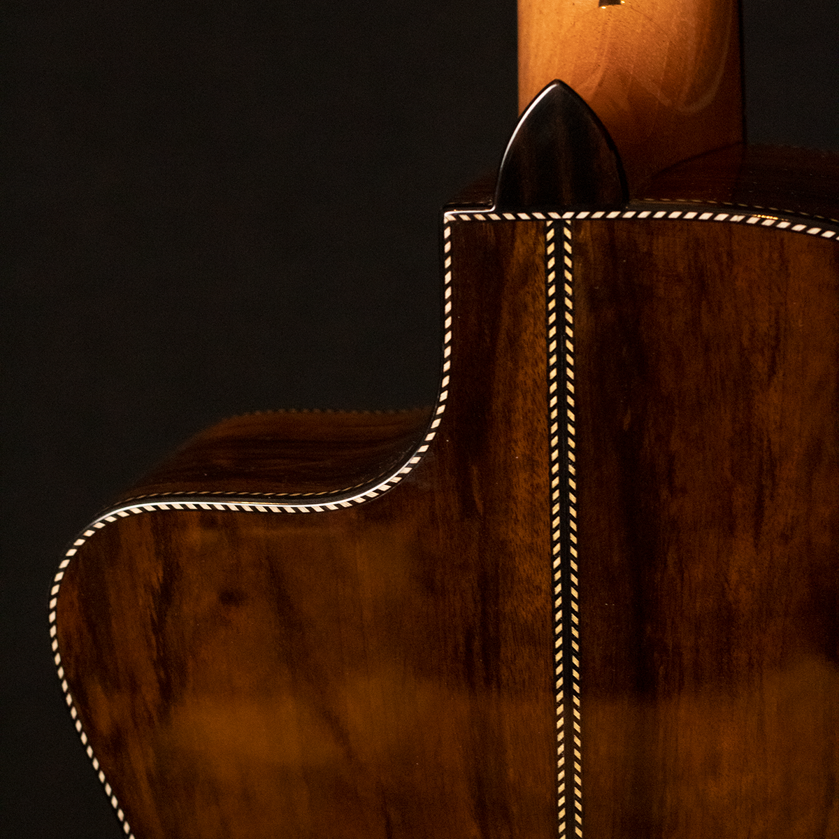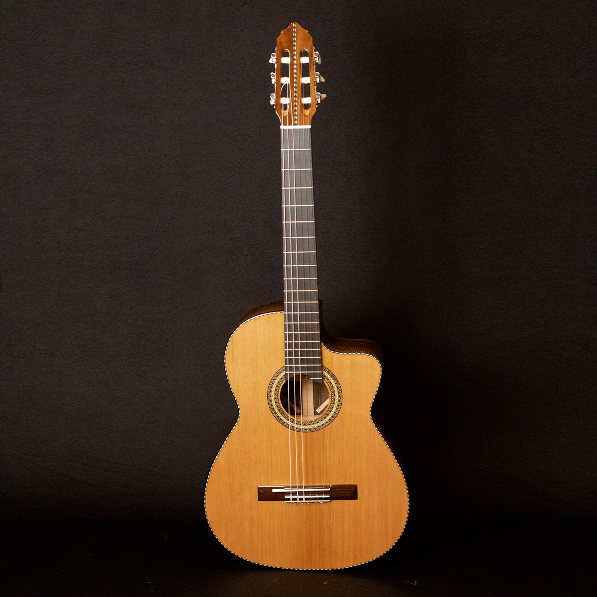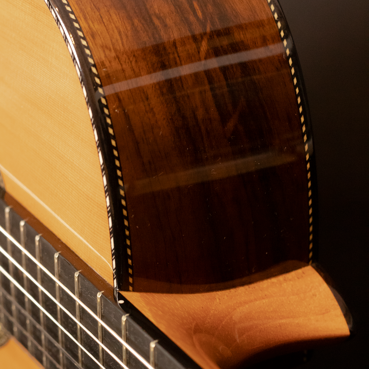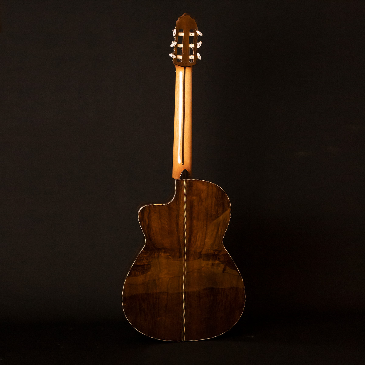 • Laterais e Fundo: Jacarandá Baiano, madeira nobre de altíssimo valor acústico, responsável por graves profundos, sustain longo e timbre encorpado, conferindo ao instrumento uma sonoridade densa e harmoniosa.
