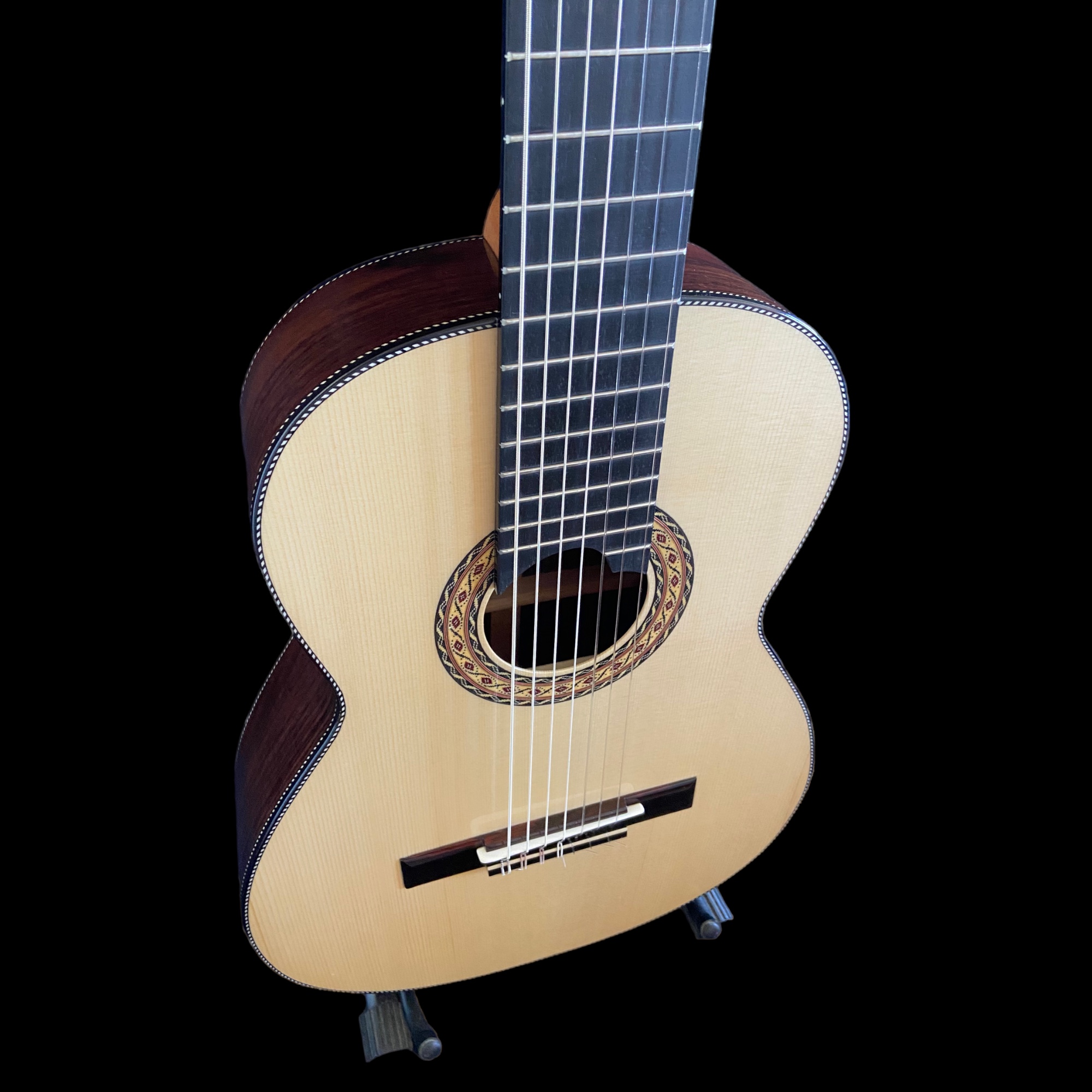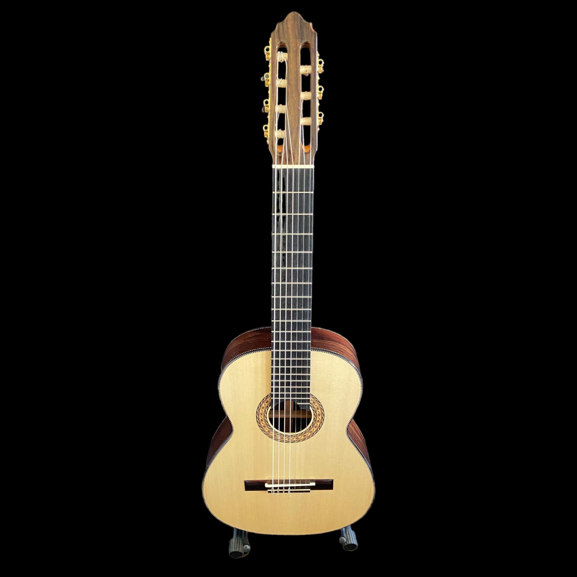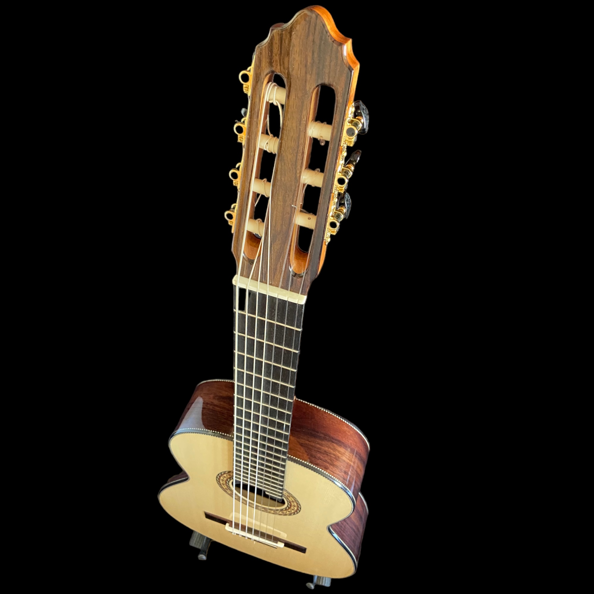 7 cordas nylon. Corpo em Jacarandá, tampo em Pinho e escala em Ébano. Construção artesanal do Luthier Araujo.