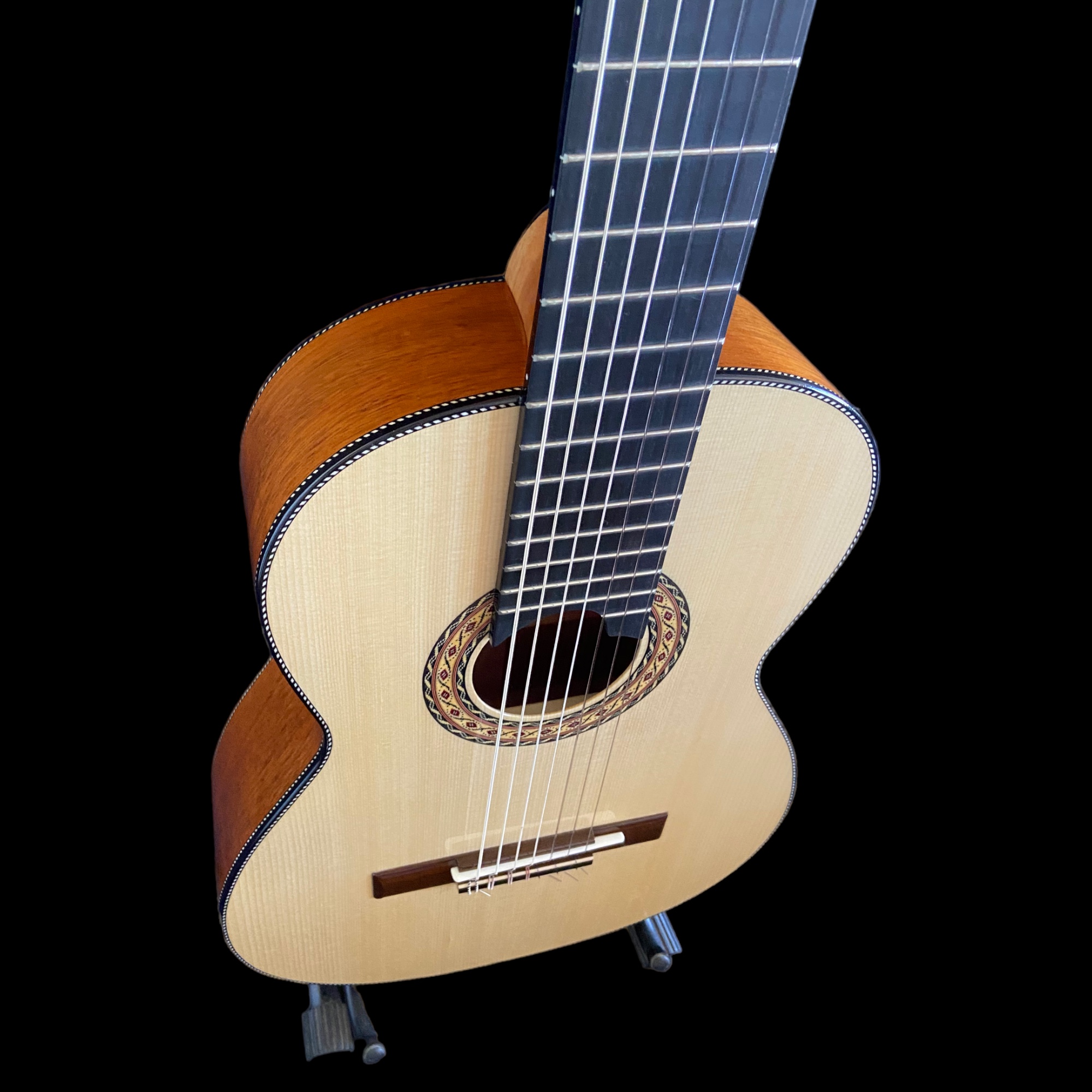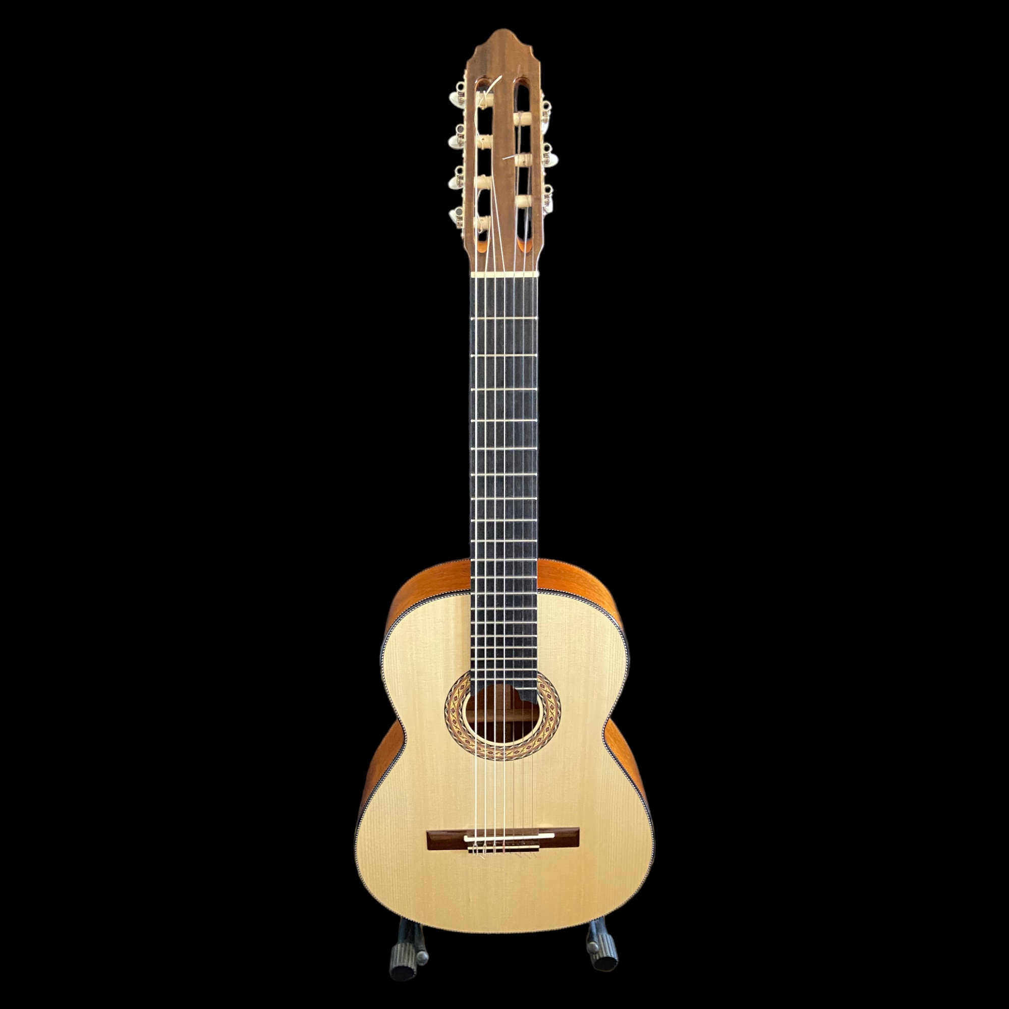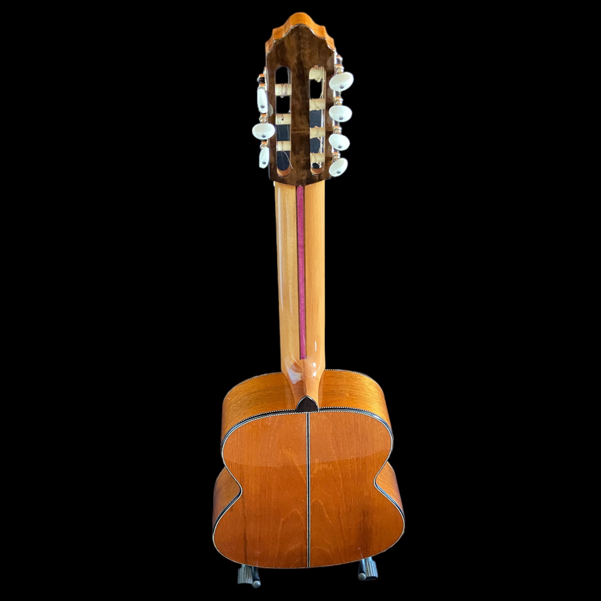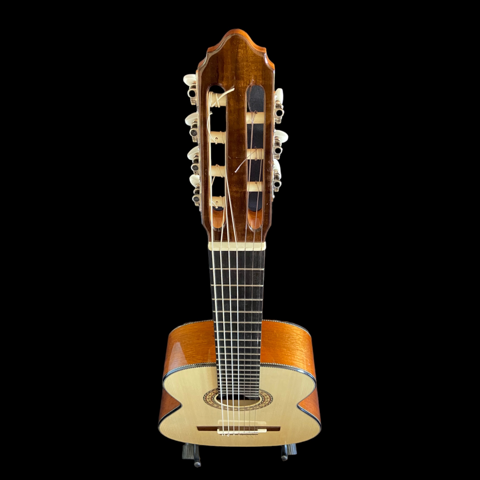 7 cordas nylon. Corpo em Mogno, tampo em Pinho e escala em Ébano. Construção artesanal do Luthier Araujo.