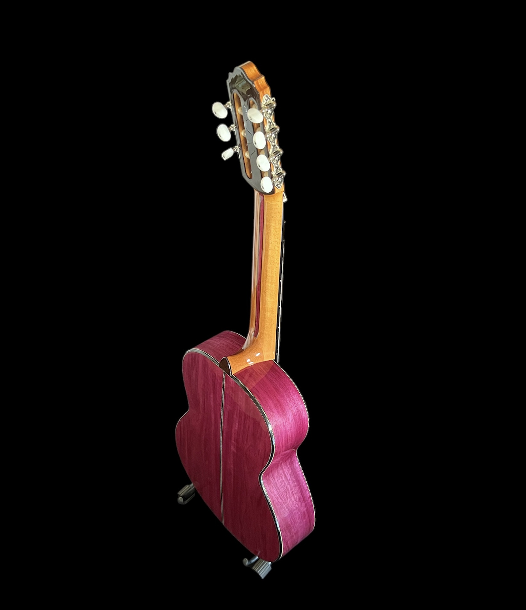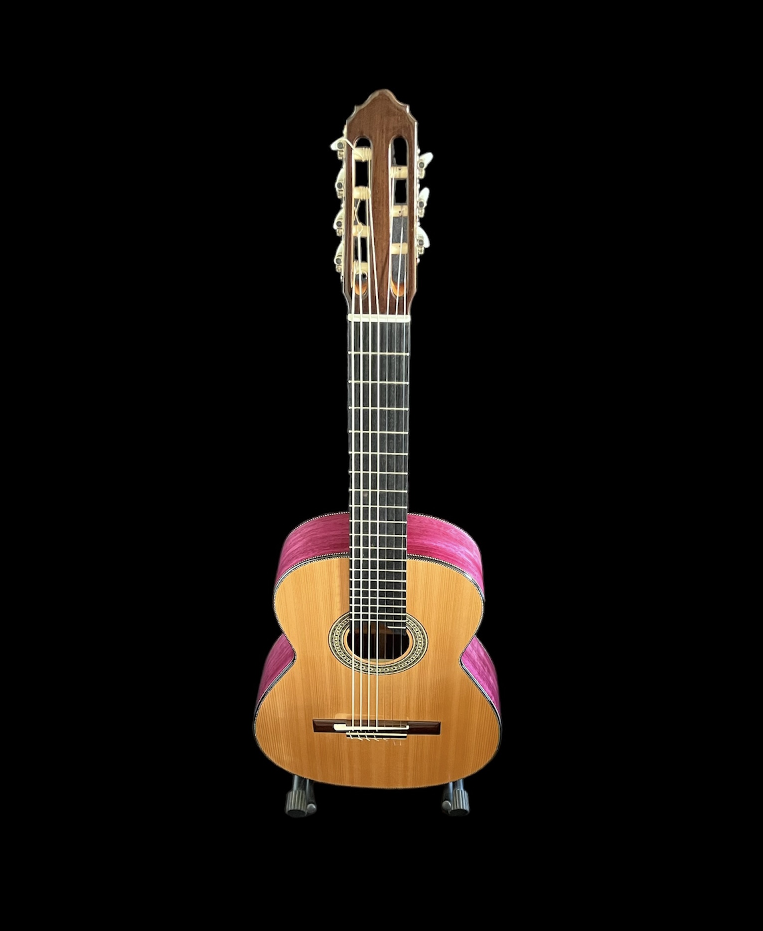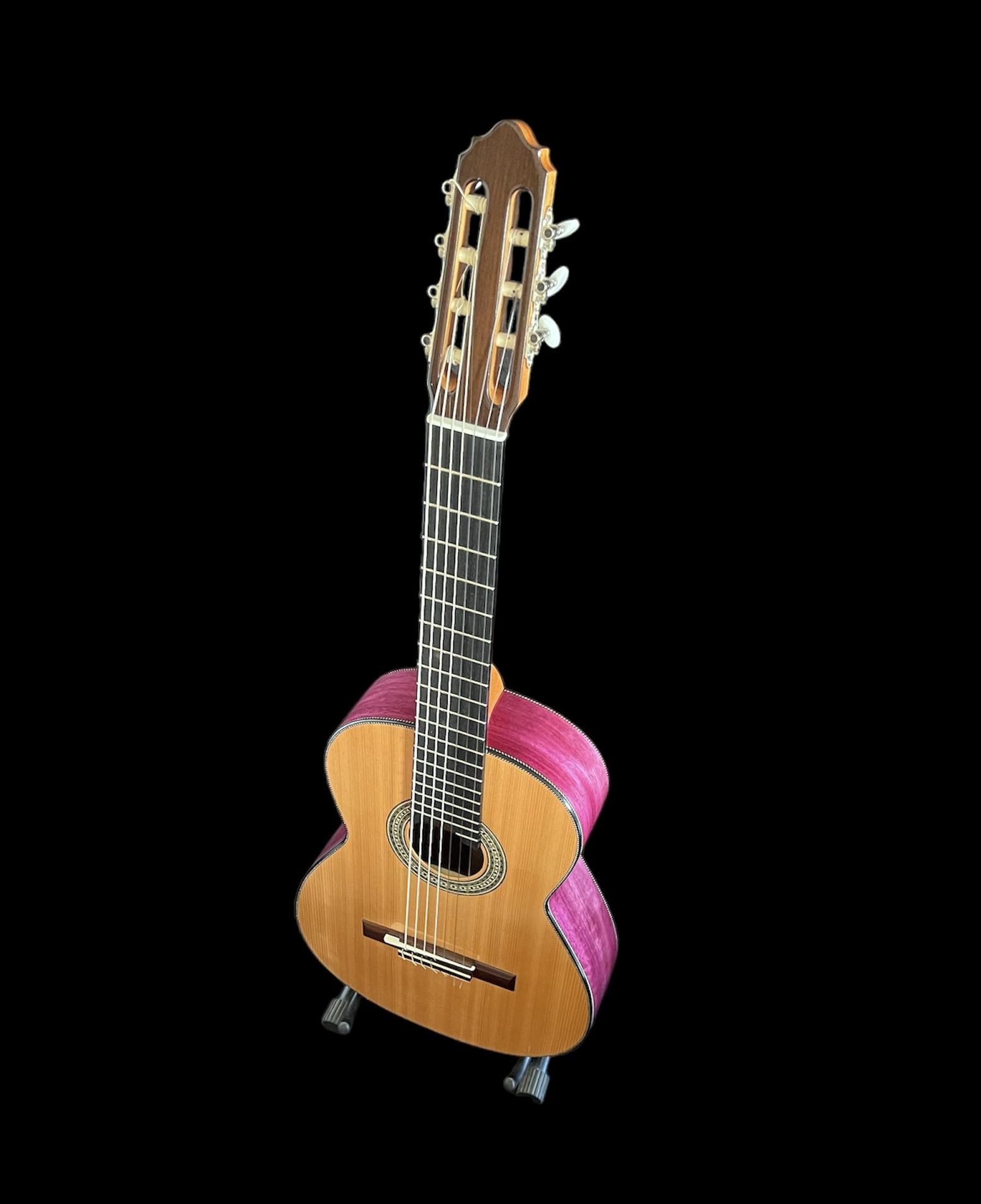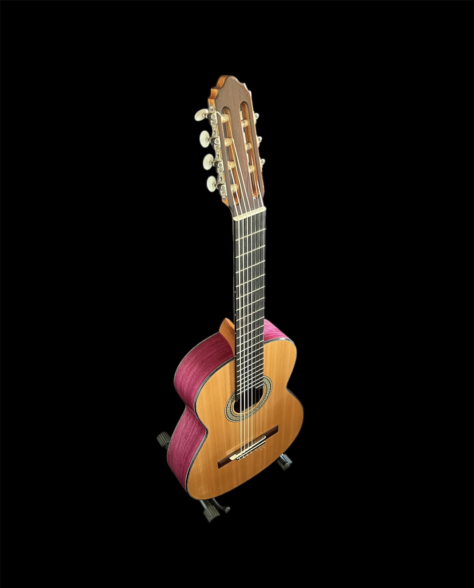 7 cordas nylon. Corpo em Roxinho, tampo em Cedro e escala em Ébano. Construção artesanal do Luthier Araujo.