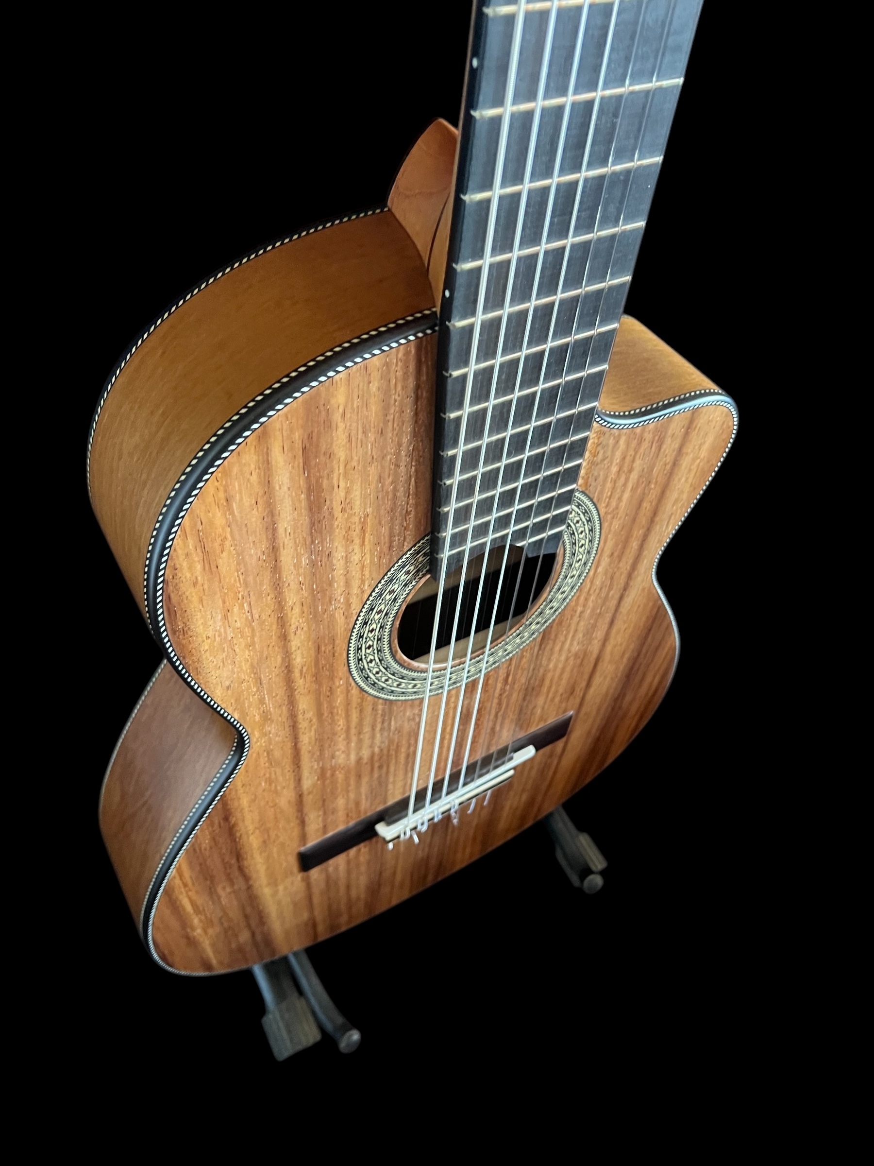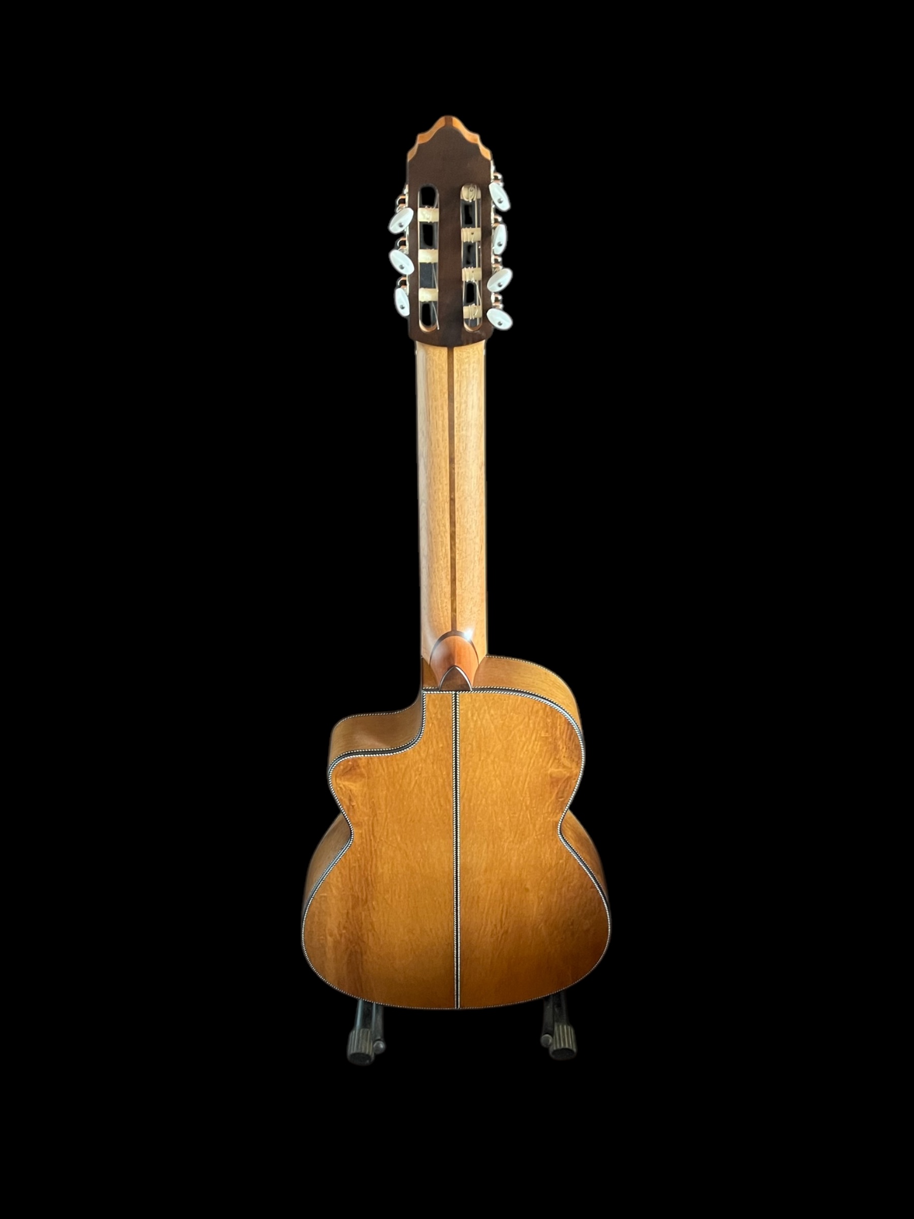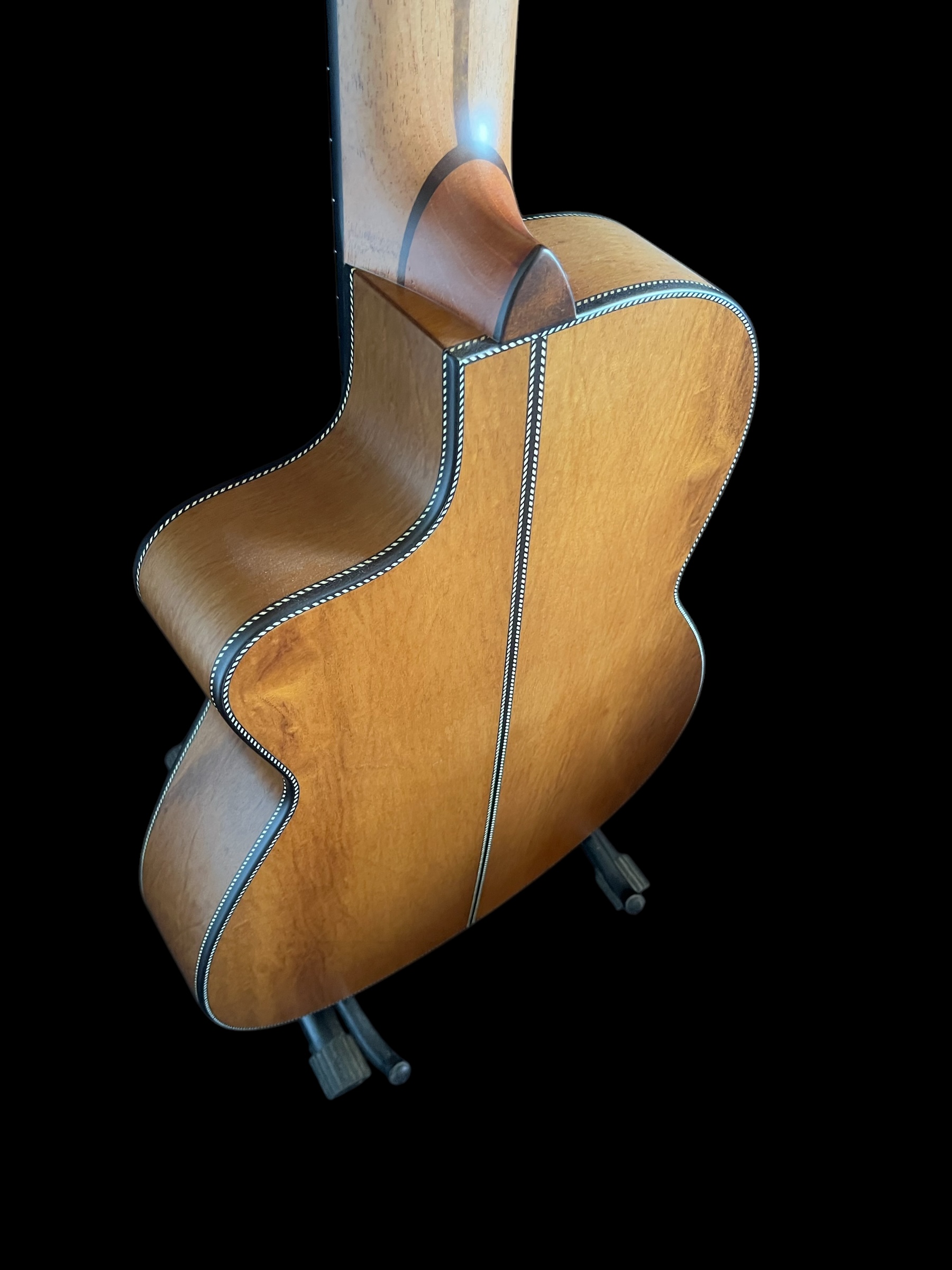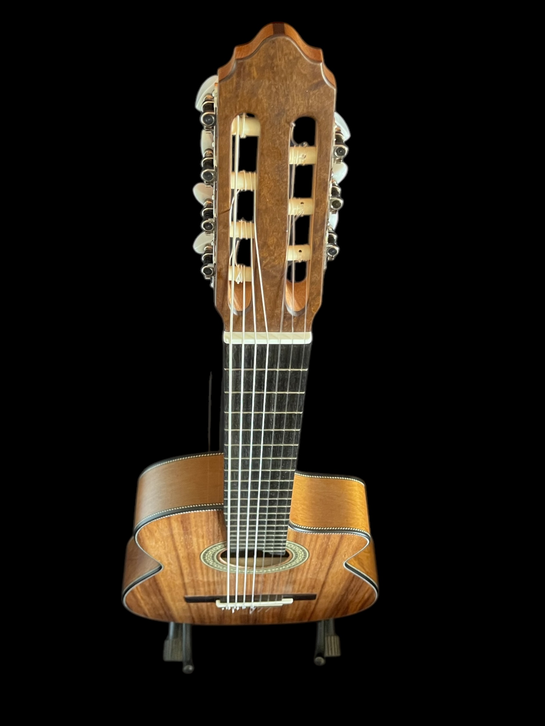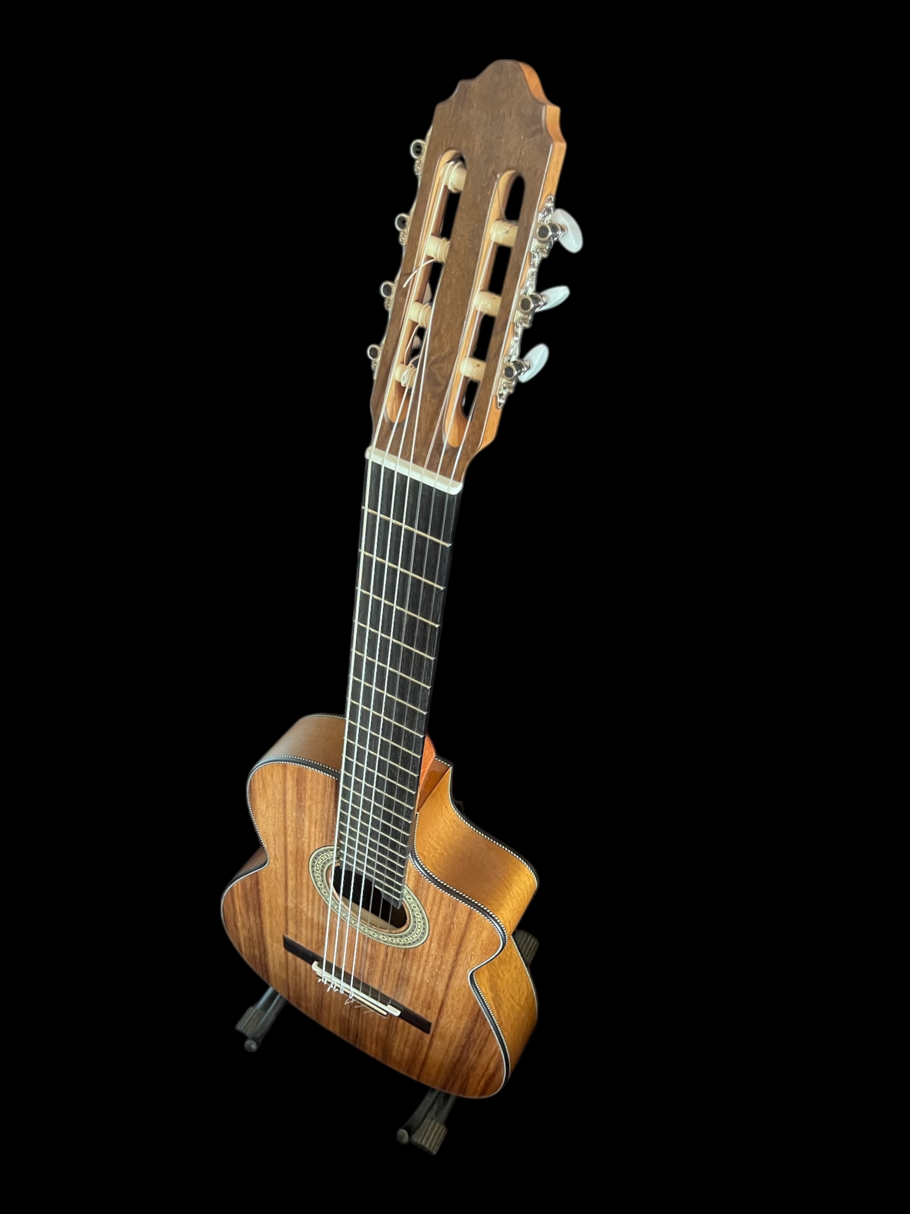7 cordas nylon. Corpo em Timburi, tampo em Pinho e escala em Ébano. Construção artesanal do Luthier Araujo.